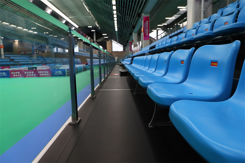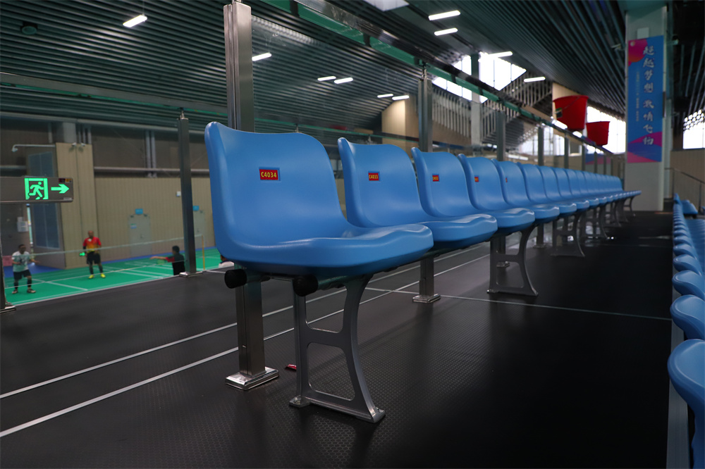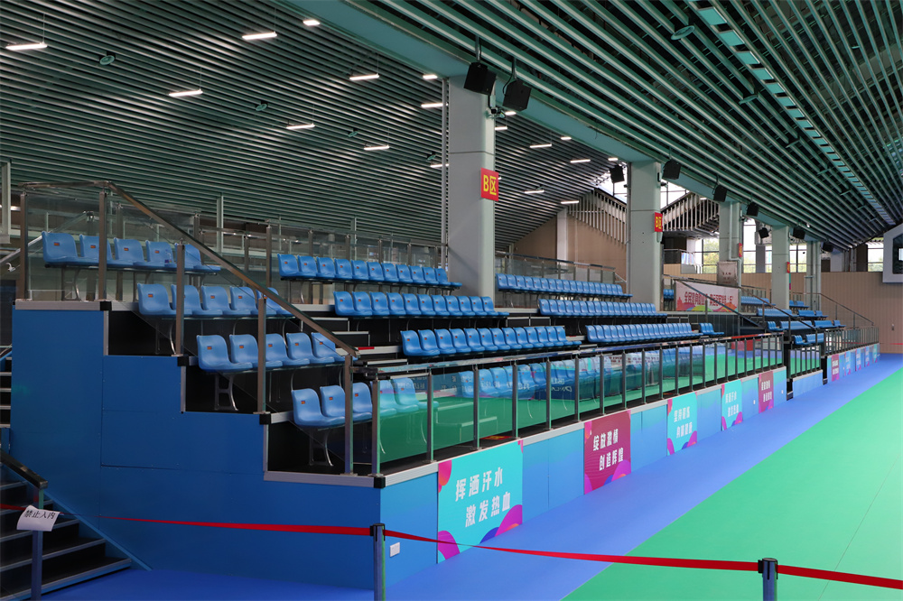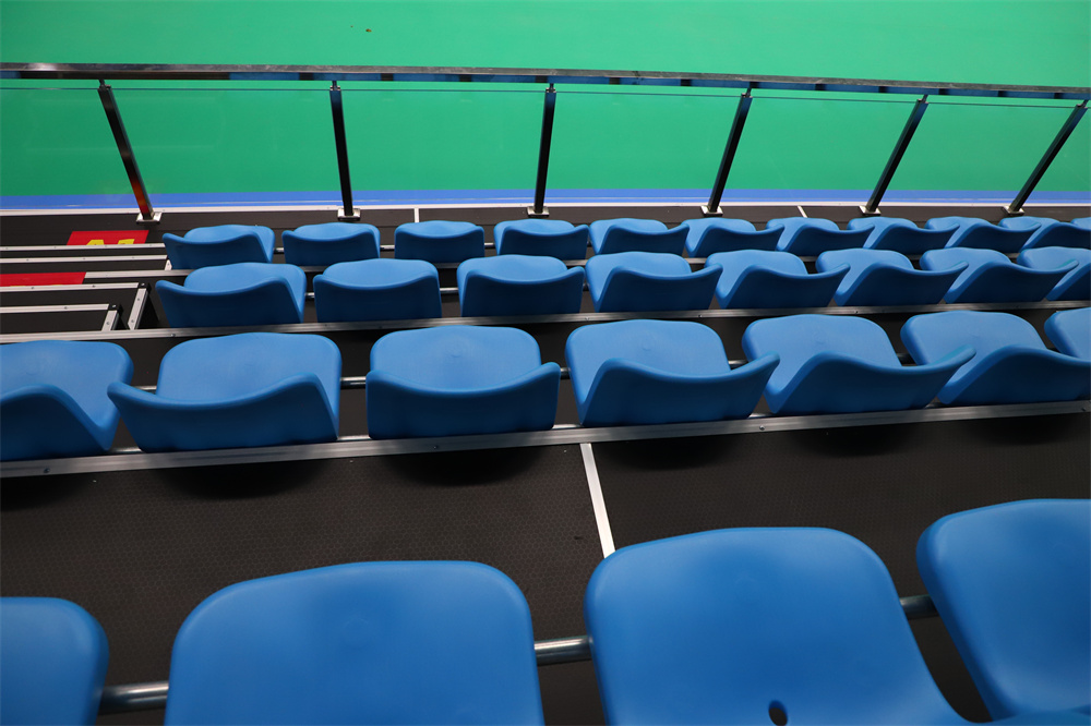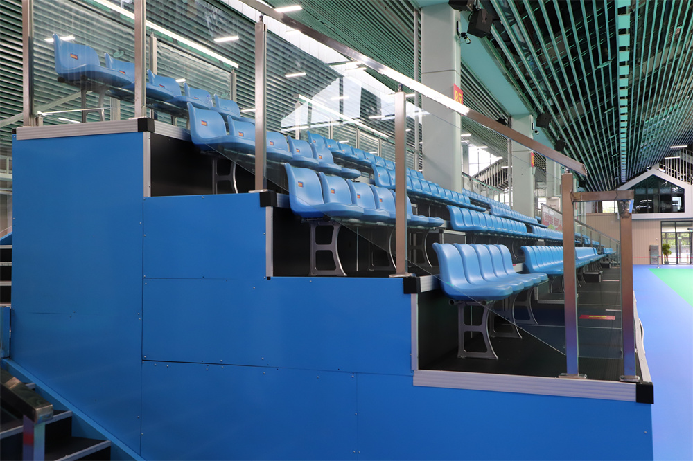 我司綠蛙看臺具體為:伸縮看臺后置式氣輔椅99位,固定金屬看臺中靠背立裝座椅687位,固定金屬看臺主席位24位。 其中固定金屬看臺在首層起高1米后,四周以金屬板全封閉,并采用和座椅同色的噴涂顏料,整體協調一致。上下通道設置在看臺側方及后方,連接區域為一條寬1.8米的通道,輔以玻璃護欄,整體高端大氣。