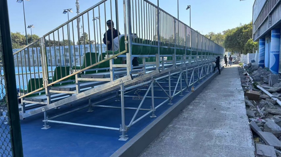 本看臺采用快速拼裝式看臺(模塊式安裝)。φ48X3焊管立柱,踏板采用鋁合金板,每平方米承重不低于500KG,首層從地面起,錯層高250mm(不含座椅),層寬750mm,左右兩側及尾層需加不銹鋼安全防護欄,高度1100mm.看臺支架鋼材表面采用鍍鋅處理;